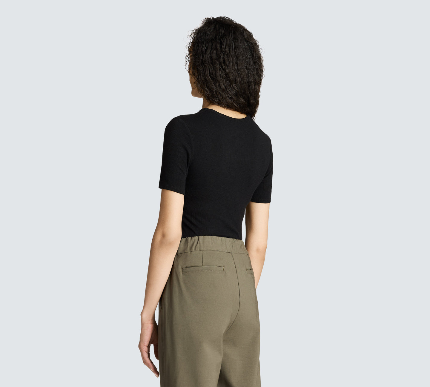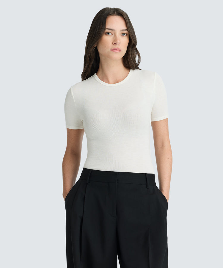 The fitted tee you’ll reach for every time. Enhanced with the natural performance of Merino wool, this ribbed closet staple is made with a fitted fabric, making it perfect for effortless layering.