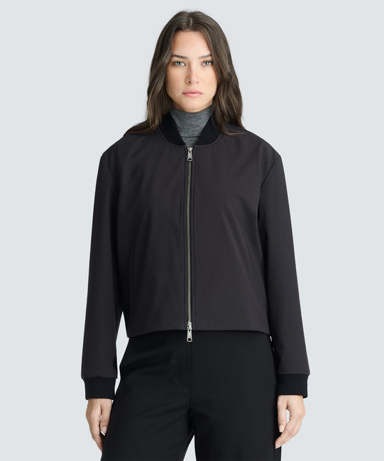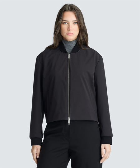 A classic bomber, made for travel. Built with a bonded fabric combining a weather-resistant shell with a Merino-rich interior and cupro lining for breathable comfort and adaptability—from breezy terminals to brisk city streets.